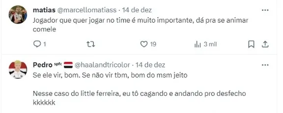 Posteriormente, Julio Casares também falou sobre o Ferreirinha. Para ele, é um jogador de interesse do São Paulo, mas que tem muitos obstáculos e, por isso, não está nem perto de acontecer.