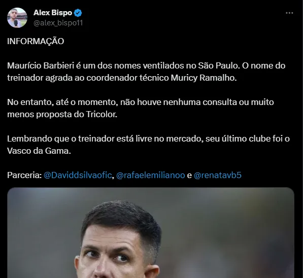 A informação é dos repórteres Alex Bispo, Rafael Emiliano, David Silva e Renata Villas Boas. Segundo eles, Barbieri agrada ao coordenador de futebol Muricy Ramalho para assumir a equipe em uma temporada muito importante, com a volta do São Paulo a Libertadores.