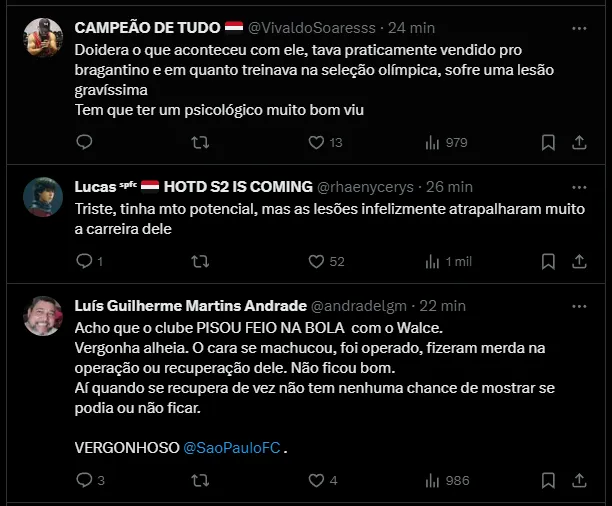 Walce retornou ao São Paulo após rápido empréstimo ao Juventude, onde pouco atuou. Com a grave lesão no joelho, Walce não jogou pelo Tricolor Paulista em 2023, assim, não terá o contrato renovado.