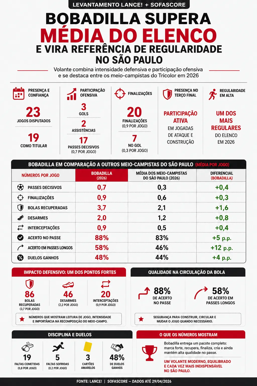 Bobadilla tem se tornado um dos jogadores mais confiáveis do São Paulo nesta temporada de 2026. O volante aparece como peça central no funcionamento da equipe, com números que evidenciam regularidade e impacto em diferentes momentos do jogo.