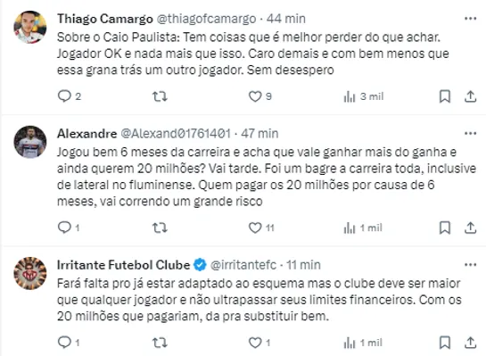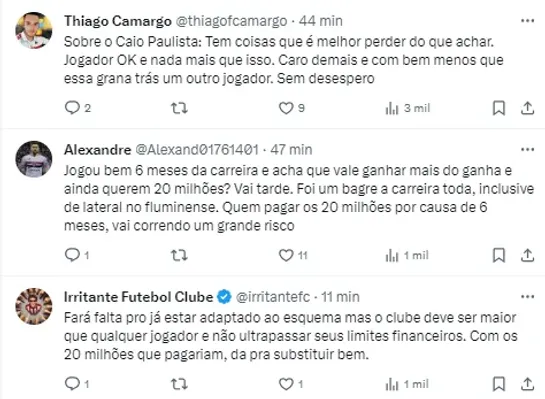 Além do atleta, as condições também não foram aceitas pelo Fluminense. Logo, Caio não é mais jogador do Tricolor Paulista. O lateral inclusive entrou no trending topics como assuntos mais comentados.