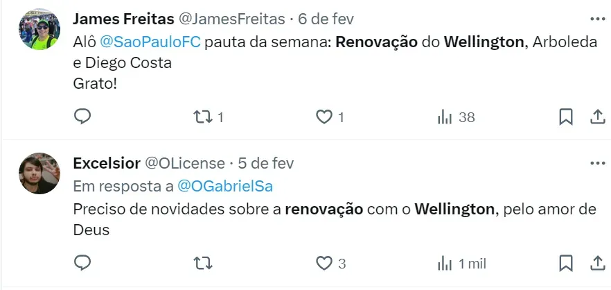 Ainda segundo a reportagem da GOAL Brasil, o São Paulo vê Wellington como peça importante para o elenco e deve insistir nas conversas para tentar chegar a um acordo com os representantes do jovem jogador.