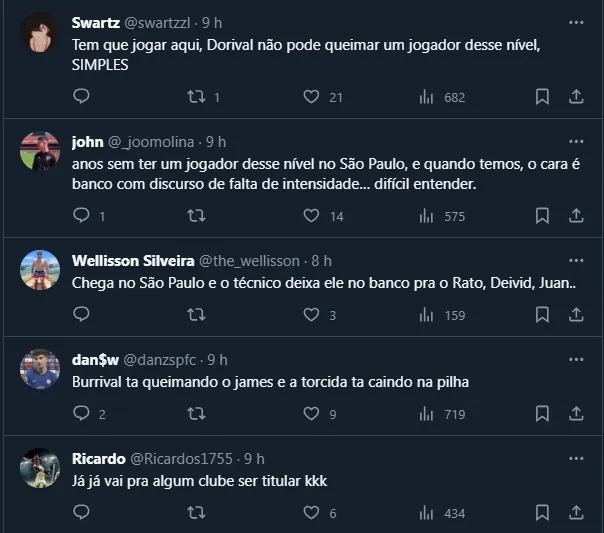 Isto é, dentre os 274 jogadores que já entraram em campo, James é o que mais cria grandes chances de gols e o que mais dá passes decisivos. Até por isso, o técnico Dorival Júnior recebeu críticas da torcida tricolor nas redes sociais.