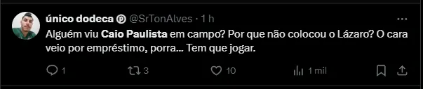 Boa parte dos torcedores não aprovam o início de temporada de Caio Paulista com a camisa do Palmeiras: “Alguém viu Caio Paulista em campo? Por que não colocou o Lázaro?‘, disse um torcedor.