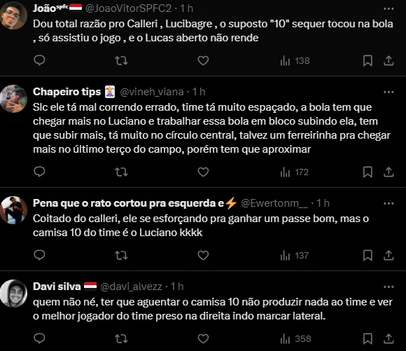 “Dou total razão pro Calleri, o suposto “10” sequer tocou na bola , só assistiu o jogo , e o Lucas aberto não rende” e “Coitado do Calleri, ele se esforçando pra ganhar um passe bom, mas o camisa 10 do time é o Luciano kkkk”, foram alguns comentários.