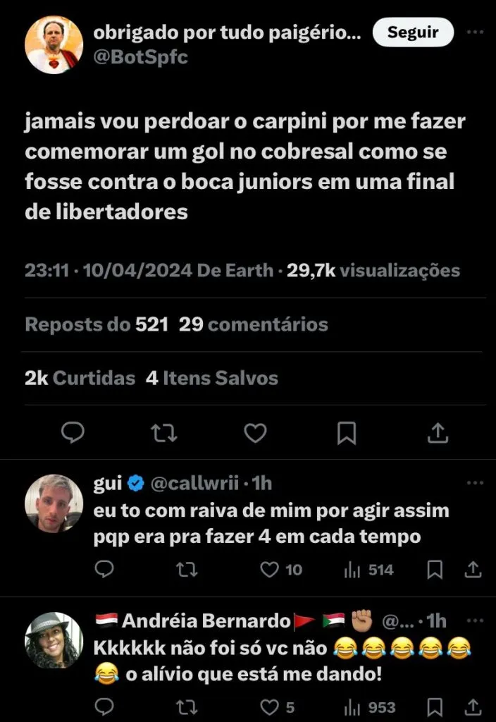 Recém-recuperado de lesão, Calleri deu razão às cobranças feitas pelos torcedores ainda no intervalo do jogo: “Acho que foi um jogo difícil, a gente não conseguiu fazer gols no primeiro tempo. Eles jogaram bem, o torcedor tem direito de reclamar. Quero que meu time ganhe todo jogo de 10 a 0, mas nem sempre é possível”, disse.