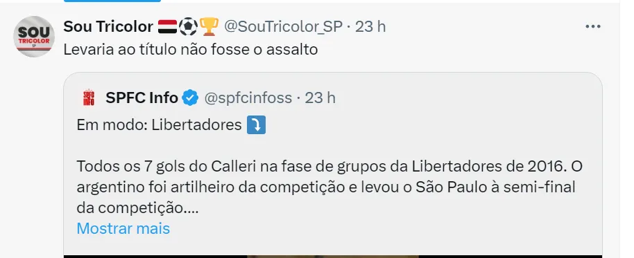 Mas, Calleri vai ter a oportunidade de atuar na sequência da Copa Libertadores e tentar alcançar os principais artilheiros do clube na competição. O São Paulo está no Grupo B e os outros adversários da chave são Barcelona, do Equador, e Cobresal, do Chile.