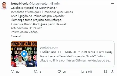 “Fluminense já iniciou os contatos com o meia James Rodríguez, que está de saída do São Paulo. O jogador é pedido do técnico Fernando Diniz e também passou pelo crivo de Marcelo, quem tem James como um de seus melhores amigos”, informou o comunicador.