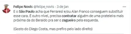 Além disso, um centroavante para ser o reserva de Calleri, titular absoluto da equipe, não está descartado, mas a busca por reforços para o setor, porém, tem sido mais difícil, ou seja, não é algo tratado como tão urgente.