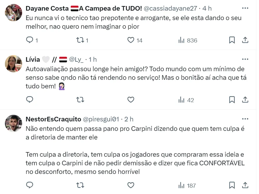Na partida contra o Fortaleza, o treinador são-paulino voltou a ser chamado de “burro” por torcedores (não foi a primeira vez que isso acontece). Nas redes sociais, a cobrança é enorme para uma troca na comissão técnica.