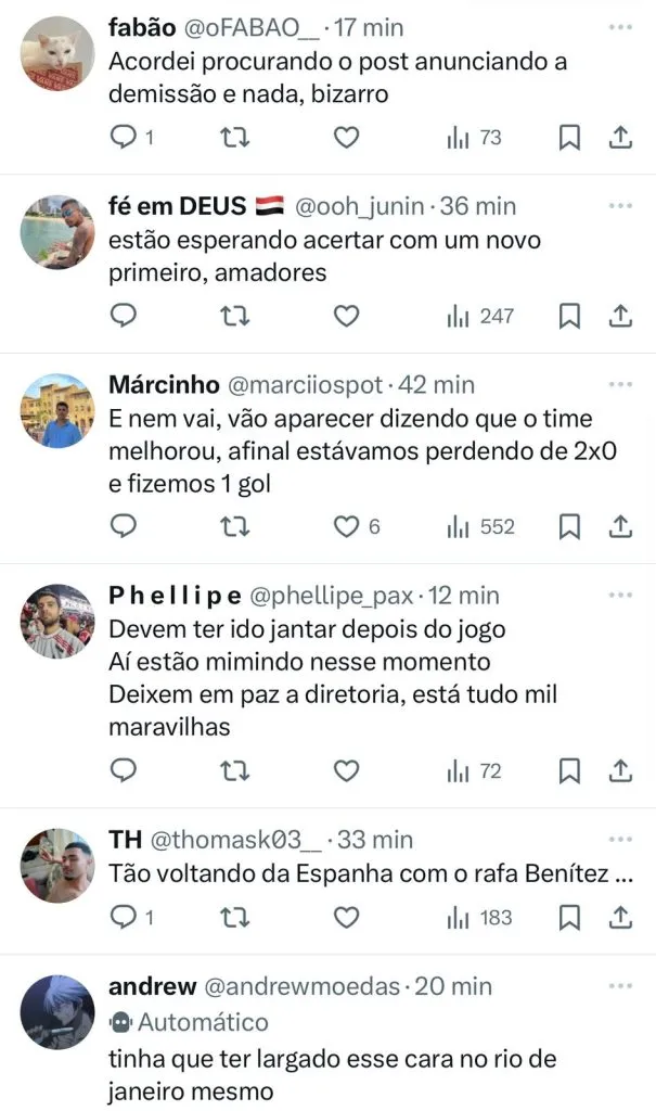 “Em relação ao noticiário, eu não me preocupo. Eu me preocupo em melhorar aquilo que todos os dias tenho oportunidade. Se a diretoria conversa ou não com outros nomes, quero acreditar que não, porque sempre tivemos uma relação de muito respeito de ambas as partes. Não vejo dessa maneira. Vejo como especulação porque acho que não teria problema algum a diretoria comunicar se isso estivesse acontecendo, pôr um ponto final, se posicionar que sim ou que não”, afirmou o comandante que se sente respaldado por Casares e trata sua saída como especulação.