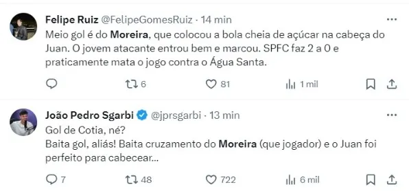 “Moreira é projetaço de lateral, completo-completo, defendendo e atacando, espetado ou por dentro. Com todo respeito ao ídolo Rafinha, mas essa é temporada pro Moreira atropelar qualquer concorrente nessa lateral”.