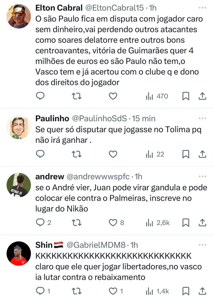 Ainda de acordo com Hernan, ao saber do interesse do atacante em jogar no time do São Paulo, o Vasco imediatamente agradeceu a todos que estavam envolvidos no negócio e saiu das tratativas, deixando o São Paulo muito próximo de fechar com seu 5º reforço para a temporada 2024.