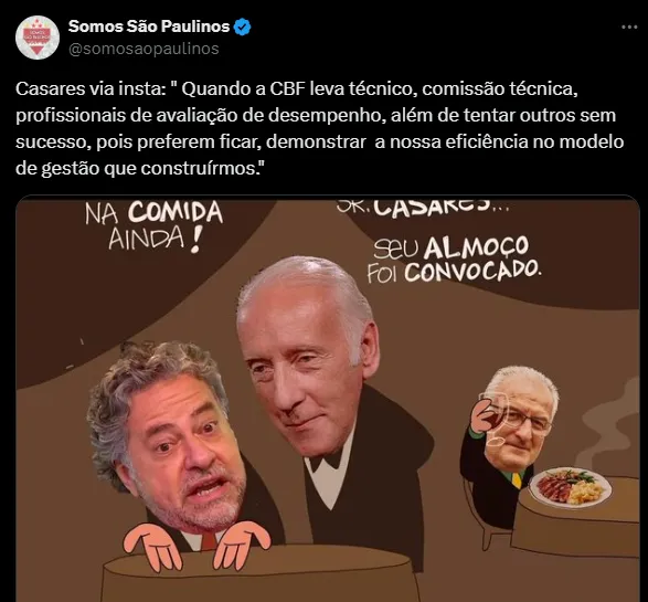 Julio Casares não deixou barato e mandou um recado à entidade do futebol nacional, de uma forma um tanto quanto irônica. O presidente repostou uma arte de Milton Trajano brincando sobre o assunto e deixou sua opinião.