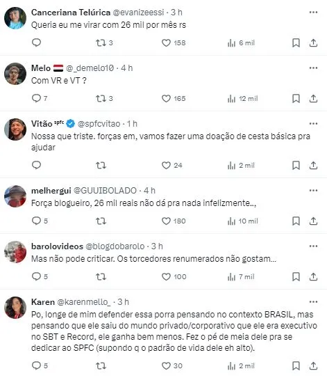 O perfil Somos São Paulinos postou as explicações do presidente e a torcida rebateu o comentário sobre o salário de forma bastante ácida: “Queria eu me virar com 26 mil por mês rs”, escreveu uma Tricolor.