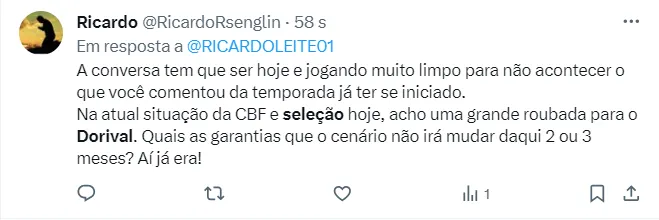 Porém, devido a atual crise política que vive a CBF, a decisão final caso o convite chegue ainda é vista com cautela. Ainda, a amizade de Dorival com Fernando Diniz, que também não tem futuro certo na seleção, é uma das questões.