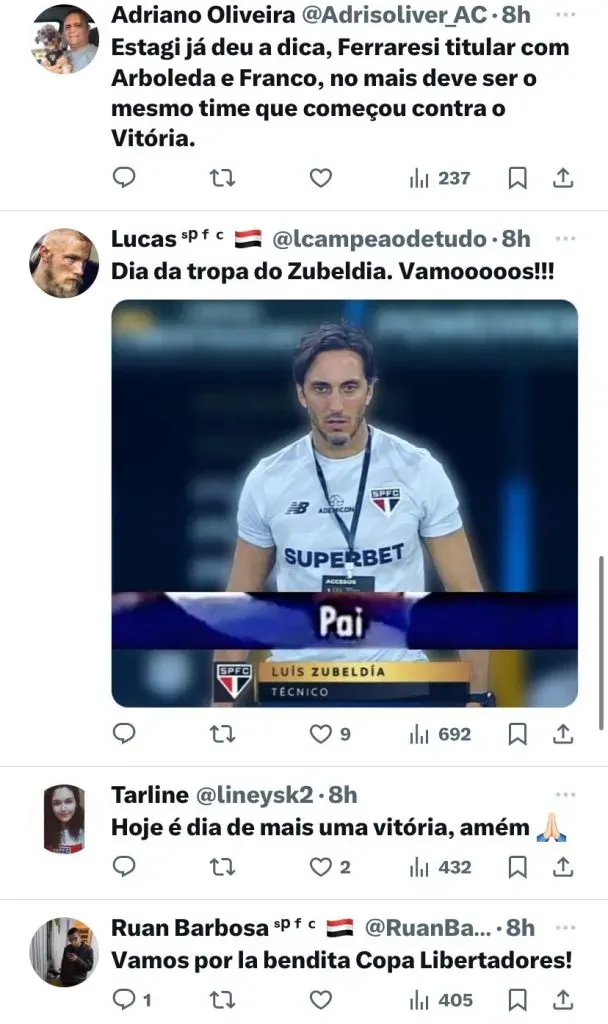 Já o São Paulo também deverá repetir uma de suas escalações. Neste caso, Zubeldía deve mandar o mesmo time que venceu o Vitória, por 3 a 1, no Brasileirão: Rafael; Diego Costa, Arboleda, Alan Franco; Igor Vinícius, Bobadilla, Alisson, Nestor e Michel Araújo; Luciano e Calleri.