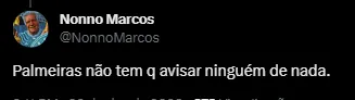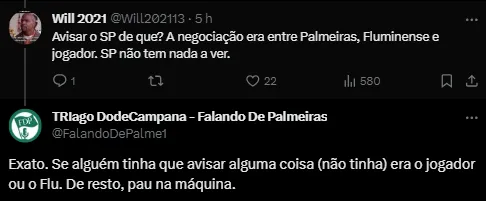 “… não é isso. Então, claramente, não é um erro em um mundo que é uma selva. O jogador foi oferecido ao Palmeiras, o clube consultou o técnico, que aprovou, e entrou na negociação. Mas no início do ano, tinha uma relação de amizade entre Casares e Leila Pereira. Não custava nada passar a mão no telefone e avisar. […] Evitaria uma confusão, um mal-estar. E ia entrar no negócio de qualquer jeito”, disse PVC.