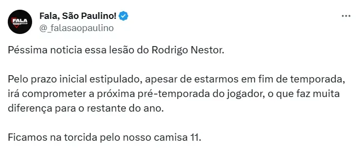 Sem ter atuado no último final de semana, o elenco são-paulino realizou atividades no CT da Barra Funda. No domingo, no entanto, uma grande fatalidade aconteceu e Rodrigo Nestor rompeu os ligamentos do joelho esquerdo.