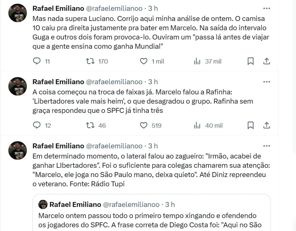 “Libertadores vale mais, hein”, o que desagradou o grupo. Rafinha, sem graça, respondeu que o “São Paulo já tinha três taças”, colocando Marcelo no seu devido lugar. De acordo com o setorista, o jogador do Flu passou a etapa inicial inteira xingando os jogadores tricolores.