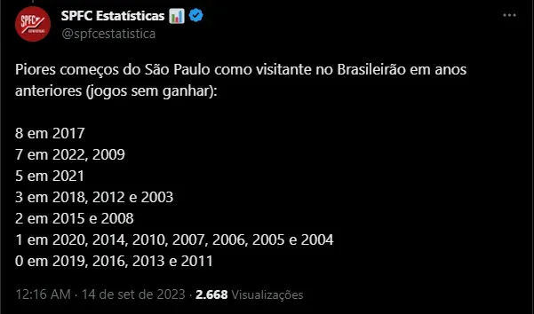 Dito isso, além de mais uma chance de vencer fora de casa ser desperdiçada, o SPFC encerrou a quarta-feira (13) com um dado extremamente negativo em sua história. Com o revés diante do Colorado, o Clube da Fé chegou a 11 jogos seguidos sem vencer como visitante. Vale lembrar que, ao lado do América-MG, o Tricolor é um dos dois únicos times que não venceram longe de casa.