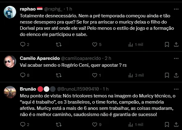 Com isso, surgiu a dúvida de quem será o novo comandante do São Paulo para a temporada. Juan Pablo Vojvoda, do Fortaleza, foi consultado, mas recusou a investida. Com isso, o Tricolor tentou uma situação caseira, tendo a ideia de Muricy, atual coordenador, assumir o cargo.