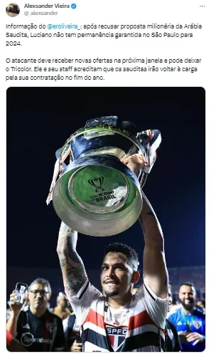 Vale lembrar, ainda conforme dados publicados pelo site Transfermarkt, que Luciano tem uma avaliação de mercado na casa dos 2,5 milhões de euros (quantia que corresponde a cerca de R$ 13,3 milhões na conversão atual). Seu contrato com o Tricolor se encerra no final de dezembro do próximo ano. Ou seja, no meio da temporada 2024 já poderia assinar um pré-contrato e deixar a equipe de graça. Com isso, a próxima janela pode ser a chance de o time faturar em casa de um negócio.