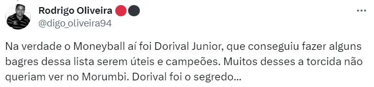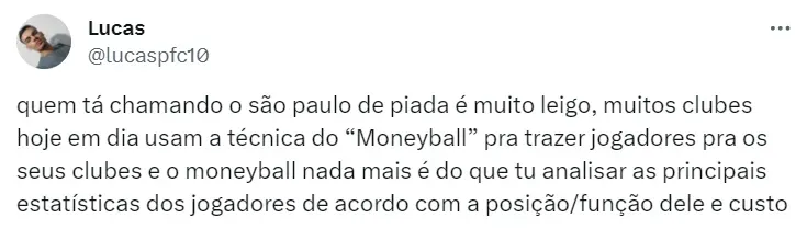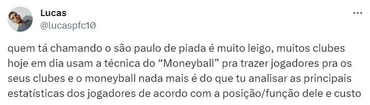 “Eu digo que é o ‘Moneyball’, você analisar, dar vazão às estatísticas, procurar os jogadores que muitos não estão olhando. Por isso o trabalho dos scouts é fundamental, para que a gente continue nessa linha: buscando jogadores com esse perfil. O Lucas e o James são as cerejas do bolo. Podemos trazer um jogador com esse perfil, mas não é porque está na Libertadores que vamos trazer três ou quatro jogadores renomados. Não é isso que a gente pensa”, declarou o diretor do São Paulo, Carlos Belmonte.