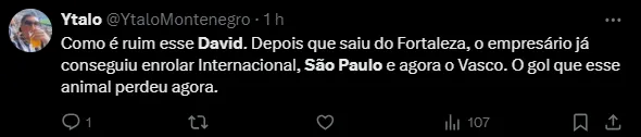 Nas redes sociais, os torcedores do Vasco não gostaram do jogo de David e detonaram o gol perdido pelo atacante. Desde que chegou por lá, foram oito partidas e um gol marcado.