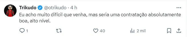 E um desejo antigo do Clube da Fé é a contratação do lateral-esquerdo Alex Sandro, de 33 anos, que atualmente joga na Juventus da Itália, e disputou a última Copa do Mundo pela Seleção Brasileira.