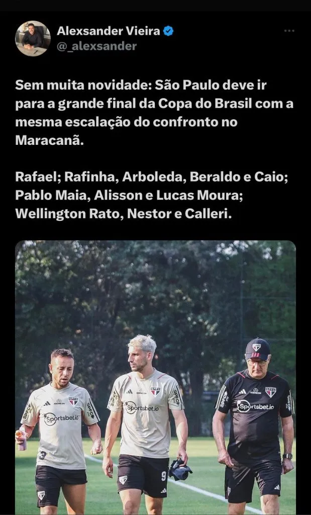 Alisson deve ser titular ao lado de Pablo Maia, ele também falou das expectativas para o jogo e como é ver o Morumbi cheio: “ É um ano muito especial para mim e para o São Paulo. Voltar a disputar uma final de competição nacional evidencia essa retomada do clube que já conquistou tantos títulos grandes. É um ano de superação, reinvenção, provação e espero terminar com esse título que será tão comemorado. Já temos uma motivação natural por vestir a camisa do São Paulo, mas quando vemos tanta gente nas arquibancadas nos apoiando, dá um ânimo maior ainda”, finalizou.