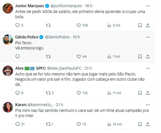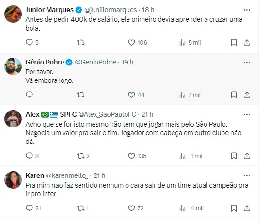 “Diante deste cenário, o natural é que o atleta deixe o São Paulo de graça no fim desta temporada, quando se encerra seu contrato”, disse o comunicado em seu canal oficial no YouTube.
