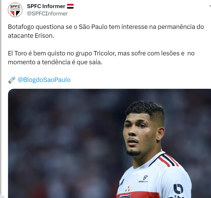 Com Erison convivendo com lesões, o que fez ele atuar em poucos jogos nesta temporada, o treinador Dorival Júnior quer para o próximo ano a contratação de um centroavante para fazer sombra a Calleri, ainda segundo informou o portal Blog do São Paulo. Erison foi uma aposta que não deu certo no Clube Morumbi, tendo em vista sua pouca contribuição dentro de campo. O jogador fez apenas três partidas no Brasileirão.