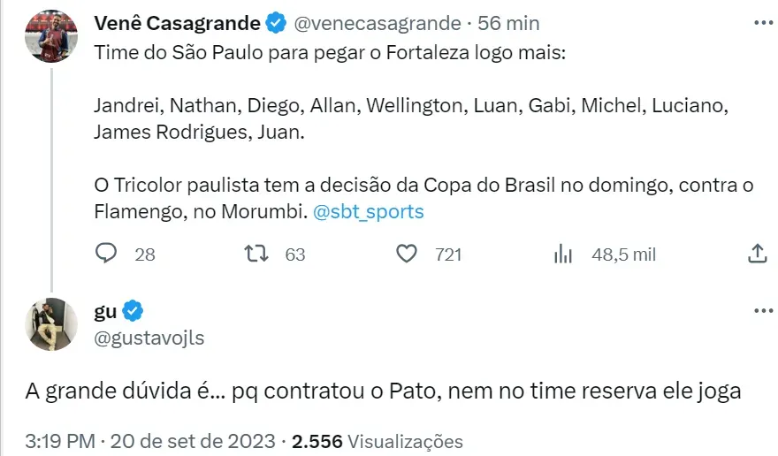 Em seu Twitter, Venê Casagrande informou a escalação do São Paulo para o jogo desta noite com: Jandrei, Nathan, Diego, Allan Franco e Wellington; Luan, Gabriel Neves e Michel Araújo, Luciano, James Rodrigues e Juan. Esse é a última partida do Tricolor Paulista antes do segundo jogo da final da Copa do Brasil e o torcedor são-paulino espera por uma boa apresentação para melhorar a colocação da equipe no Brasileirão.