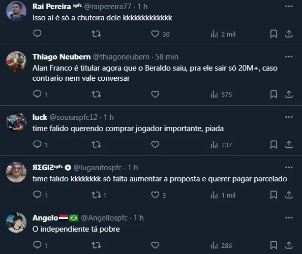 Além do mais, o venezuelano está retornando de uma gravíssima lesão de joelho e ainda não é uma certeza para a temporada. Até por isso, o SPFC não pretende negociar Alan Franco, mas as coisas estão difíceis.
