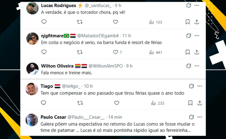 Por fim, apenas da fala demonstrar que Lucas Moura está bem fisicamente e se preparando para uma nova temporada, muitos torcedores aproveitaram para criticá-lo na web. Veja alguns comentários: