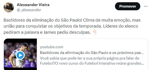A diretoria também aproveitou para dar total apoio respaldo para a comissão técnica e também para o jogadores, deixando bem claro que derrotas acontecem, mas o grupo é bom e sempre terá aprovação dos diretores do Morumbi. A ideia é de tirar uma grande lição do confronto contra a LDU, para cometer o mínimo de erros possíveis para conseguir vencer o Flamengo nos dois jogos da Copa do Brasil.