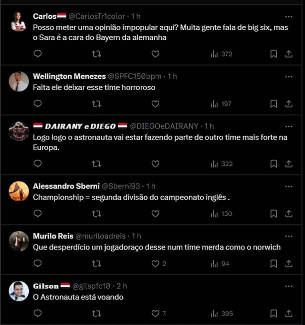 “Logo logo o astronauta vai estar fazendo parte de outro time mais forte na Europa“. Outro torcedor até citou Ceni, que deu oportunidades durante 2021 e 2022.