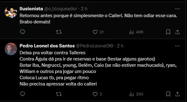 Segundo o GE, na terça-feira (21), Calleri realizou alguns trabalhos no campo do CT da Barra Funda. Dessa maneira, o centroavante argentino participou de treinos que simulam situações das partidas.