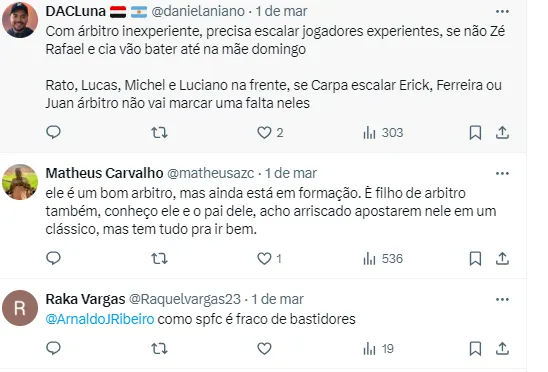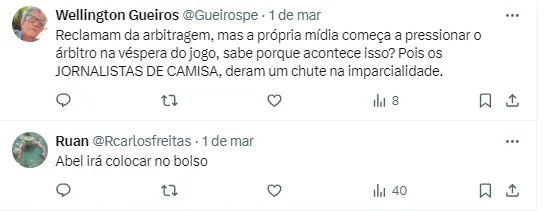 No X, o antigo Twitter, muitos são-paulinos deixaram claro que se o juiz não se impor, o treinador Abel Ferreira, famoso por reclamar muito, vai acabar se aproveitando da inexperiência do profissional.