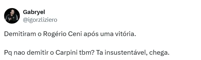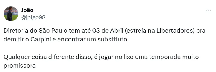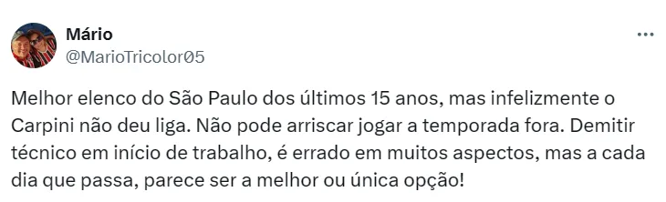 Deste modo, a expectativa da diretoria é que Carpini consiga engrenar o time novamente no decorrer da temporada e que a equipe dispute os principais títulos de 2024, fazendo frente a Palmeiras, Flamengo, Atlético e outros.
