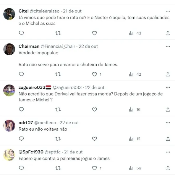 Muitos torcedores se surpreenderam com a atitude do técnico Dorival Júnior em fazer algumas alterações no confronto contra o Grêmio. Por opção, o comandante escalou Michel Araújo, James Rodriguez e David entre os titulares, deixando Luciano, Nestor e Wellington Rato no banco de reservas.