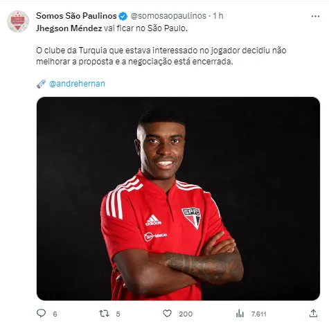 Porém, nem isso vai mais esquentar a cabeça dos tricolores. O volante Jhegson Méndez estava atraindo o interesse do Antalyaspor da Turquia, mas as negociações com os europeus não foram pra frente. Segundo André Hernan, o São Paulo ‘bateu o martelo’ e vai manter o atleta que é avaliado em R$ 13 milhões pela plataforma Transfermarkt. Com isso, ele poder ser mais um a ajudar o time na grande decisão.