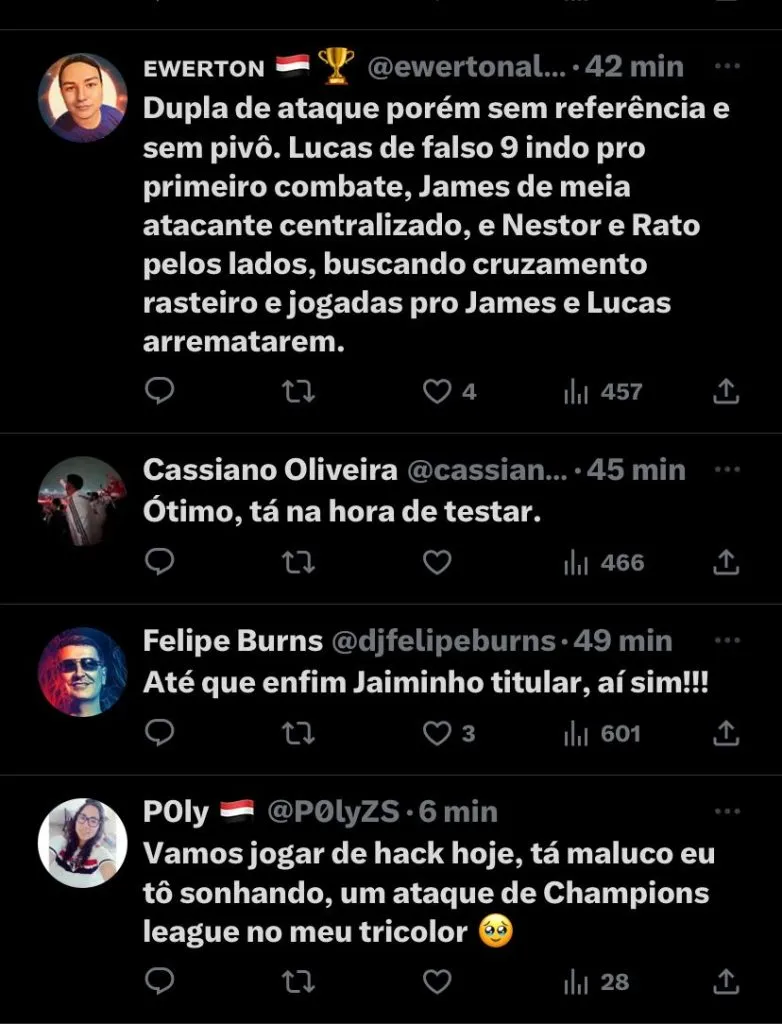 Os pendurados são Alisson, Caio Paulista, Diego Costa, Marcos Paulo, Michel Araujo, Nathan, Patryck, Raí Ramos, Rodrigo Nestor e Wellington. Apesar de todos esses problemas, a maior preocupação é de quem entraria no lugar de Calleri e foi mais que confirmado pelo jornalista Venê Casagrande: James Rodriguez. Nas redes sociais, alguns torcedores do São Paulo comemoraram a titularidade do jogador, outros não curtiram a forma que ele irá jogar.