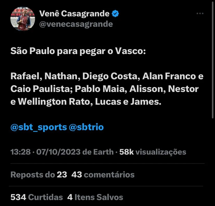 Segundo informado por Venê, Dorival definiu todo o time titular para enfrentar o Gigante da Colina em partida logo mais pelo Campeonato Brasileiro, com o Rio de Janeiro sendo palco, tendo a seguinte escalação: Rafael, Nathan, Diego Costa, Alan Franco e Caio Paulista; Pablo Maia, Alisson, Nestor e Wellington Rato, Lucas e James. O Vasco busca a vitória após ser derrotado por 4 a 1 pelo Santos, na Vila Belmiro e voltar para o Z-4.