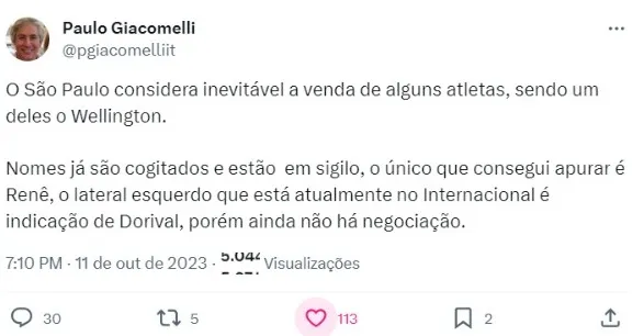 “O São Paulo considera inevitável a venda de alguns atletas, sendo um deles o Wellington. Nomes já são cogitados e estão em sigilo, o único que consegui apurar é Renê, o lateral esquerdo que está atualmente no Internacional é indicação de Dorival, porém ainda não há negociação”, informou Paulo Giacomelli, em sua conta no X (antigo Twitter).