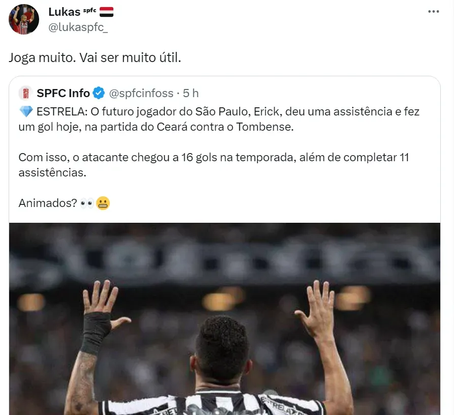 O jogador de 25 anos soma 16 gols e 11 assistências em 2023. Neste sábado (26), ele marcou um gol e deu uma assistência no empate do Ceará contra a Tombense pelo Brasileirão Série B. A notícia chegou na torcida do São Paulo, que está animada com o primeiro reforço do Clube do Morumbi para o próximo ano.