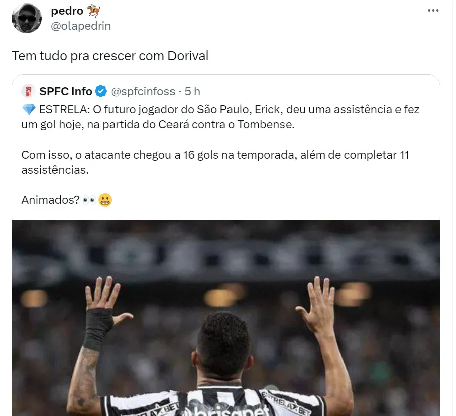 Erick é um atacante que joga pelos lados do campo e, com o vínculo pelo Ceará se encerrando, assinou um pré-contrato com o São Paulo. Ele chegou ao time cearense em 2021 e, antes, estava no Náutico. Os torcedores do Tricolor Paulista acreditam que o jogador vai ser muito útil ao time de Dorival Júnior em 2024.