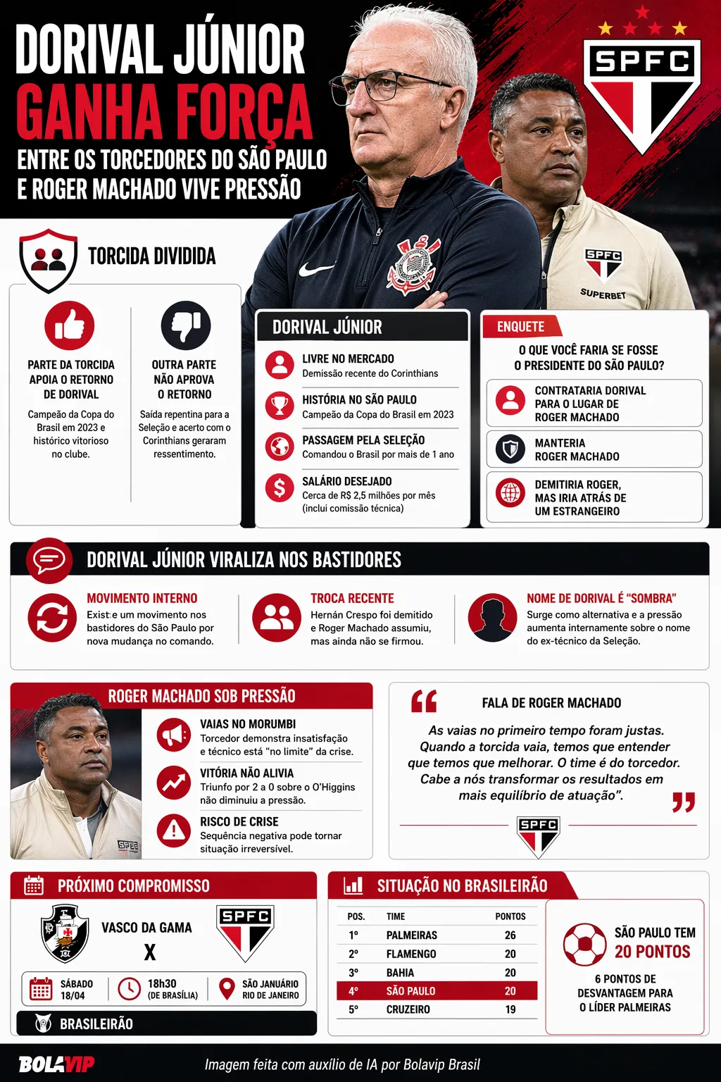 Demitido do Corinthians recentemente, Dorival Júnior está sem clube e automaticamente se torna uma alternativa no mercado da bola. No São Paulo, por exemplo, o treinador ganha força e é pedido por parte dos torcedores.