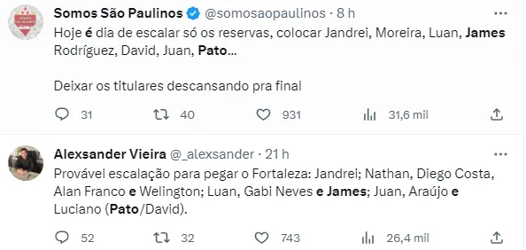Ainda conforme a publicação, o São Paulo deve ir a campo contra o Leão do Pici com o seguinte time: Jandrei; Nathan Mendes, Diego Costa, Alan Franco e Welington formando a defesa; o meio-campo terá Luan ou Jhegson Méndez, Gabriel Neves e James Rodríguez; Michel Araujo, Juan e Alexandre Pato formam o trio de ataque.